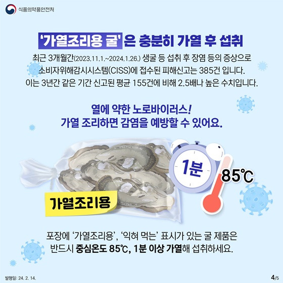 겨울철 생굴 섭취는 피하고, 해산물은 중심부까지 완전히 익혀 드세요.